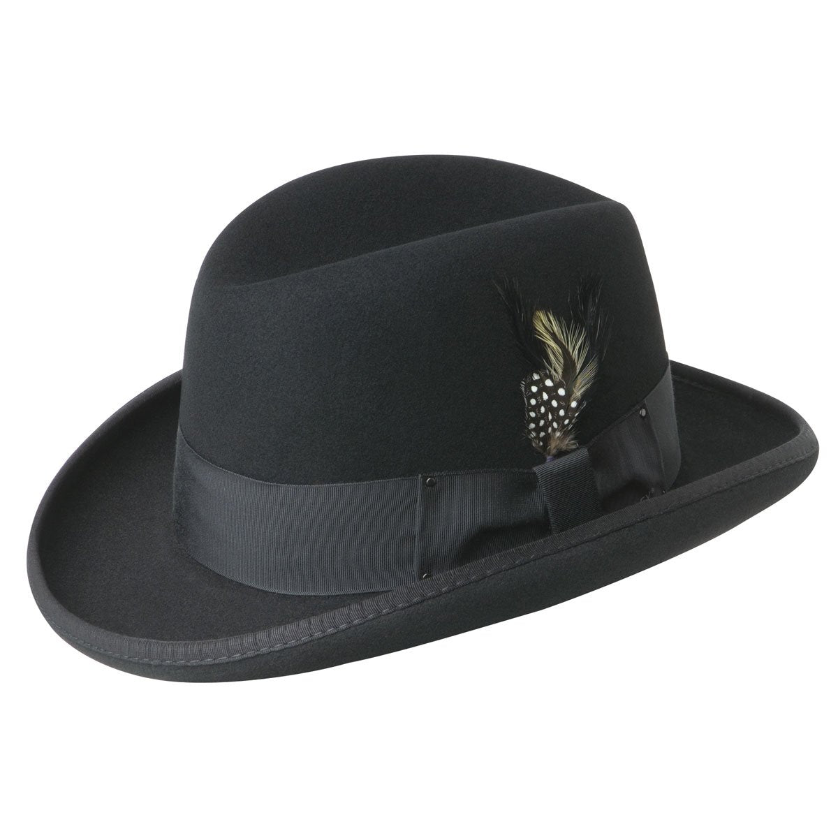 The Godfather is a vintage Homburg Crown with a Roll Brim with bound edge in our stiffened Wool Felt body. Trimmed with a traditional grosgrain band, fully lined, removable feather and Comfort Sweatband.