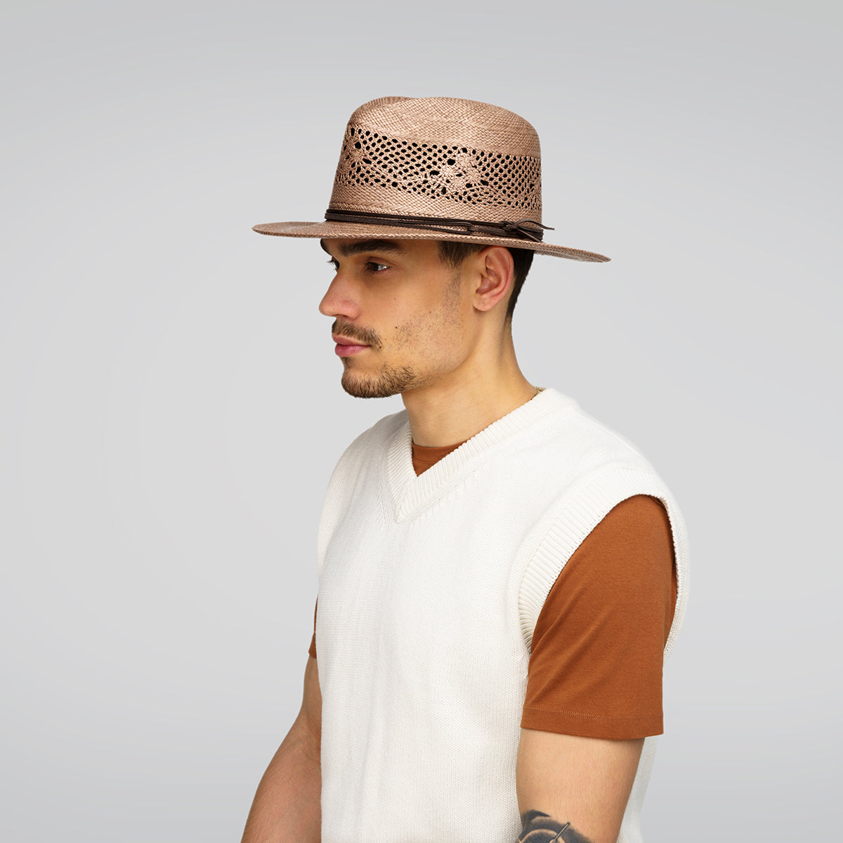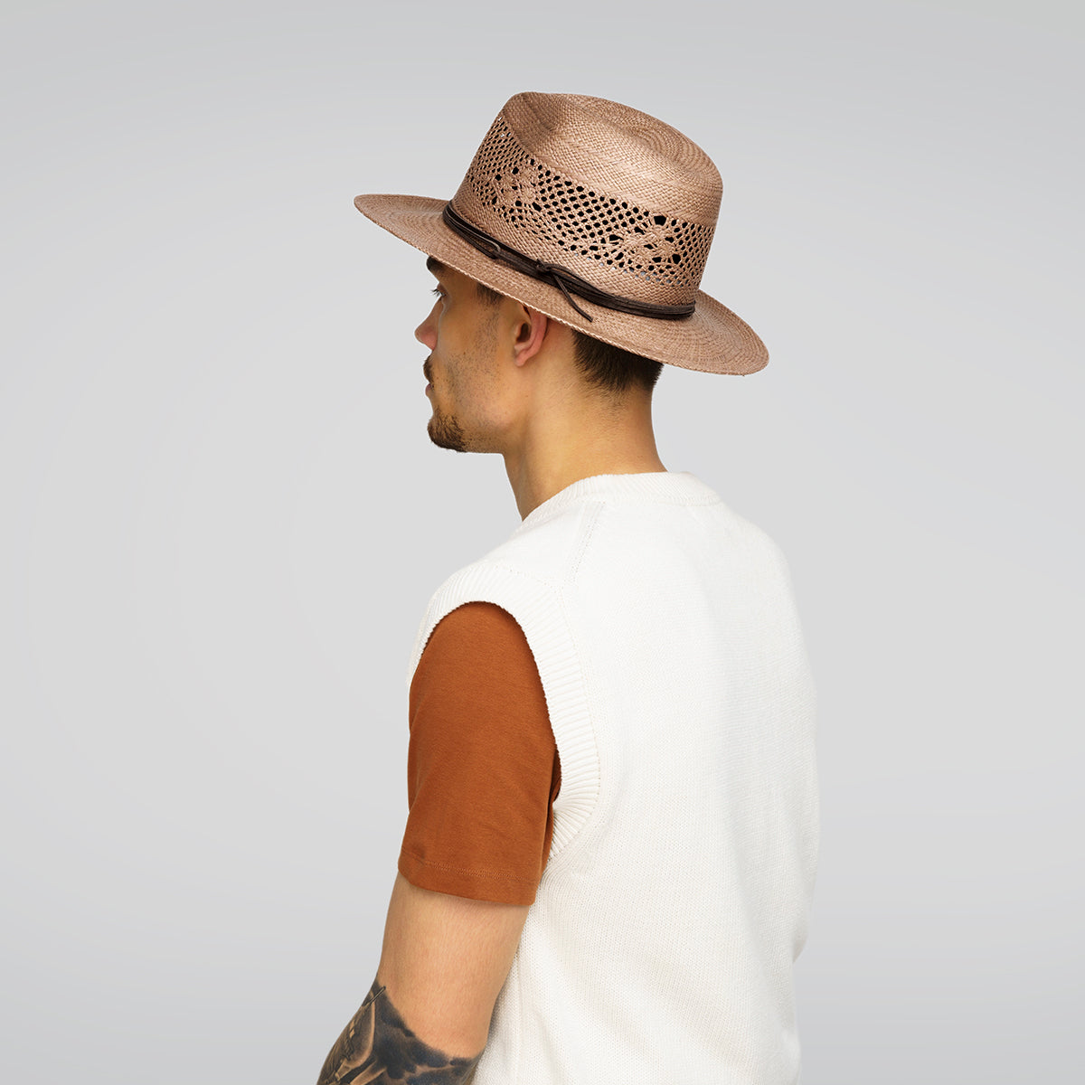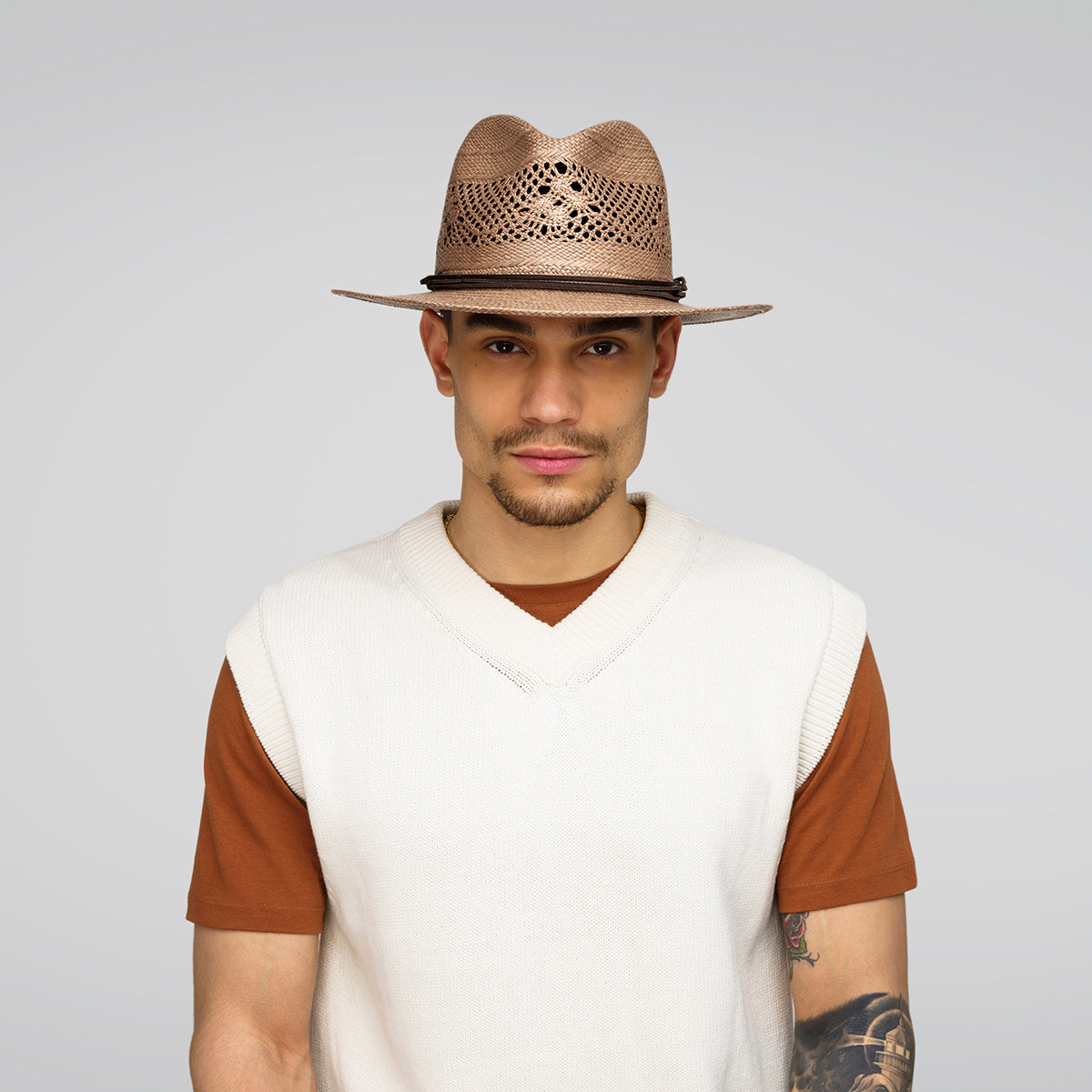 The Trappe Fedora by Bailey 1922 is an intricately vented Panama with a 4" Center Dent crown and 2 7/8" brim. It is trimmed with a thin leather cord band and fine woven sweatband.