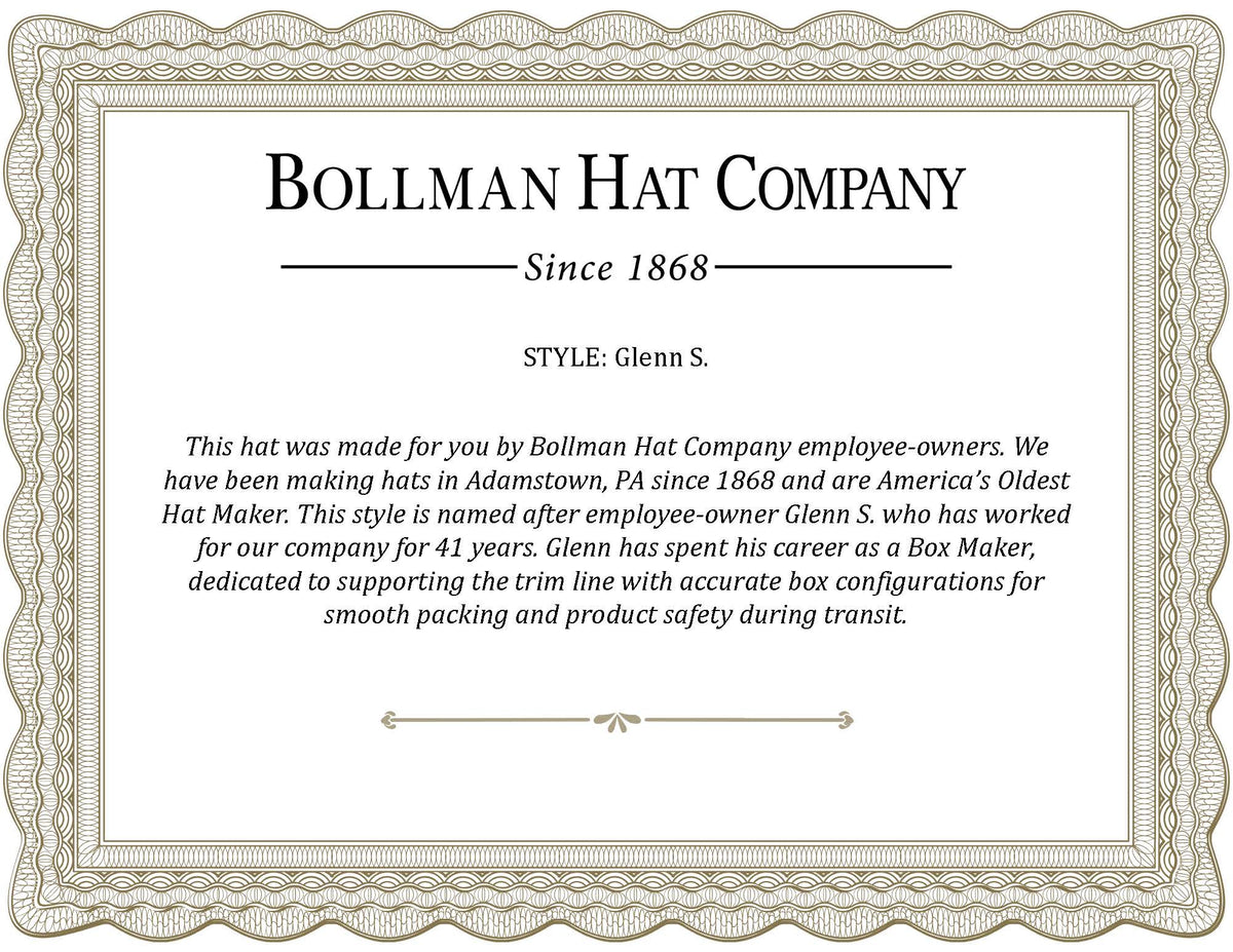 The Glenn S. is from the Bollman Hat Company Makers' Collection, a selection of hats launched in our 150th year to celebrate the spirit, craftsmanship, and heritage of Bollman Hat Company and our employee-owners. Named after an employee-owner with at least 35 years of service, each hat comes with a numbered certificate of authenticity signed by employee-owners, a photo of employee-owners in our Adamstown, PA factory, and a hat box.