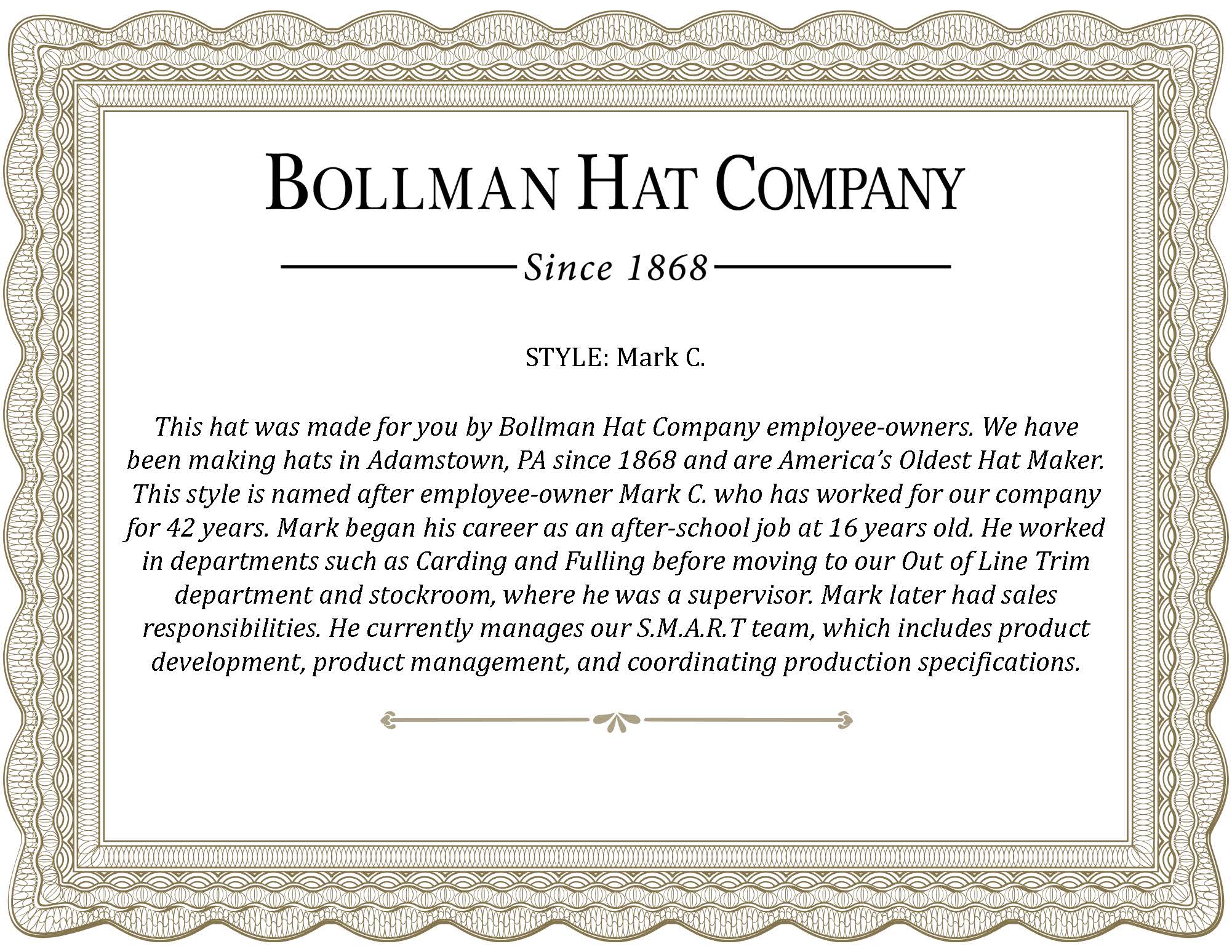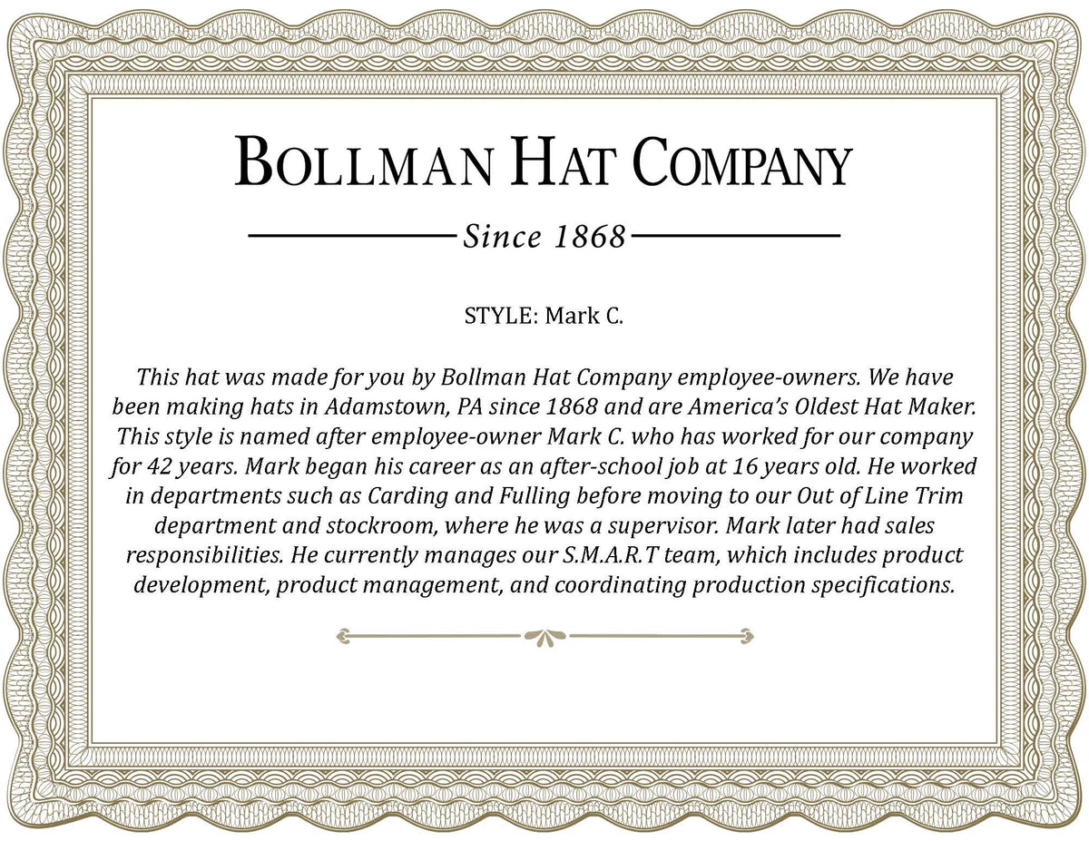 The Mark C. is from the Bollman Hat Company Makers' Collection, a selection of hats launched in our 150th year to celebrate the spirit, craftsmanship, and heritage of Bollman Hat Company and our employee-owners. Named after an employee-owner with at least 35 years of service, each hat comes with a numbered certificate of authenticity signed by employee-owners, a photo of employee-owners in our Adamstown, PA factory, and a branded hat box.