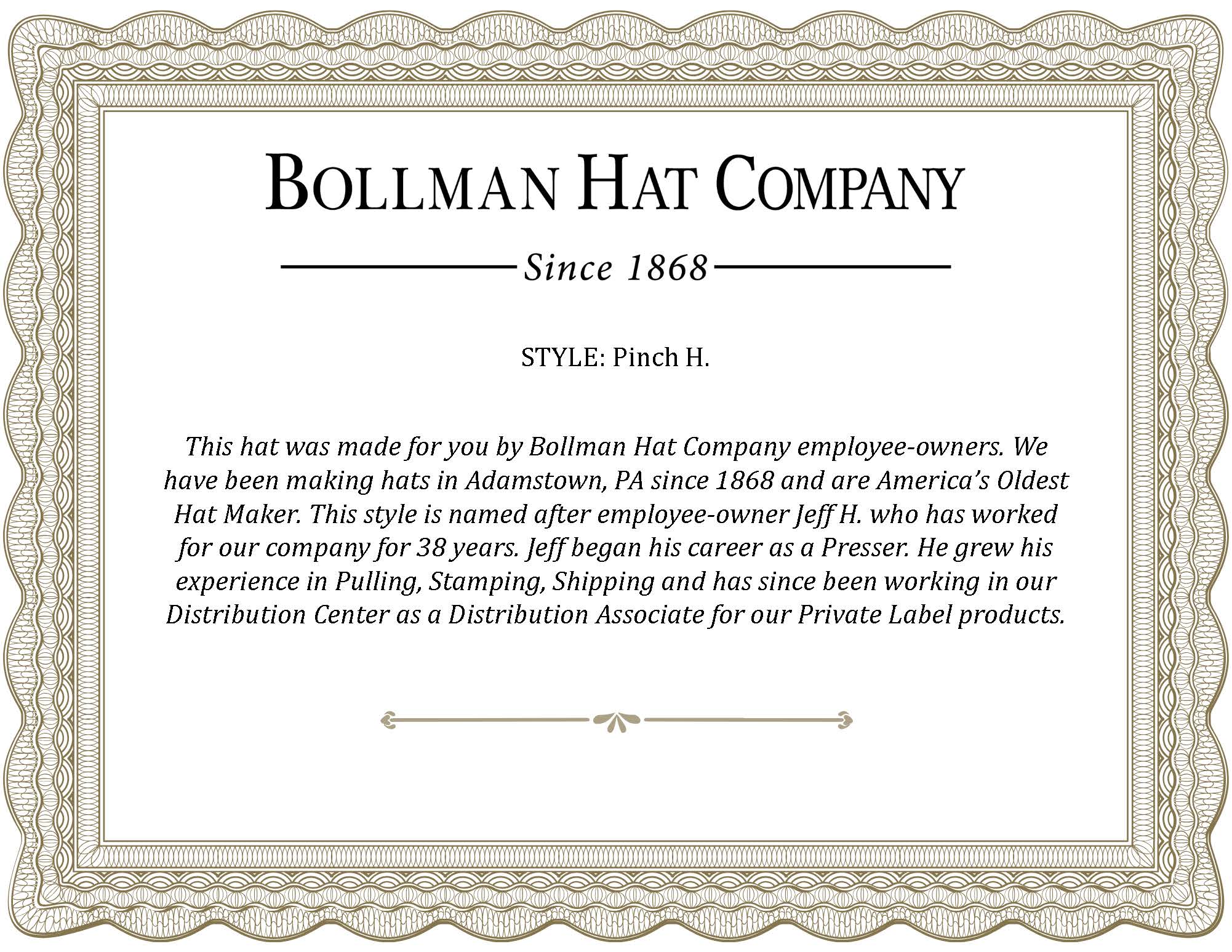 The Pinch H. is from the Bollman Hat Company Makers' Collection, a selection of hats launched in our 150th year to celebrate the spirit, craftsmanship, and heritage of Bollman Hat Company and our employee-owners. Named after an employee-owner with at least 35 years of service, each hat comes with a numbered certificate of authenticity signed by employee-owners, a photo of employee-owners in our Adamstown, PA factory, and a branded hat box.