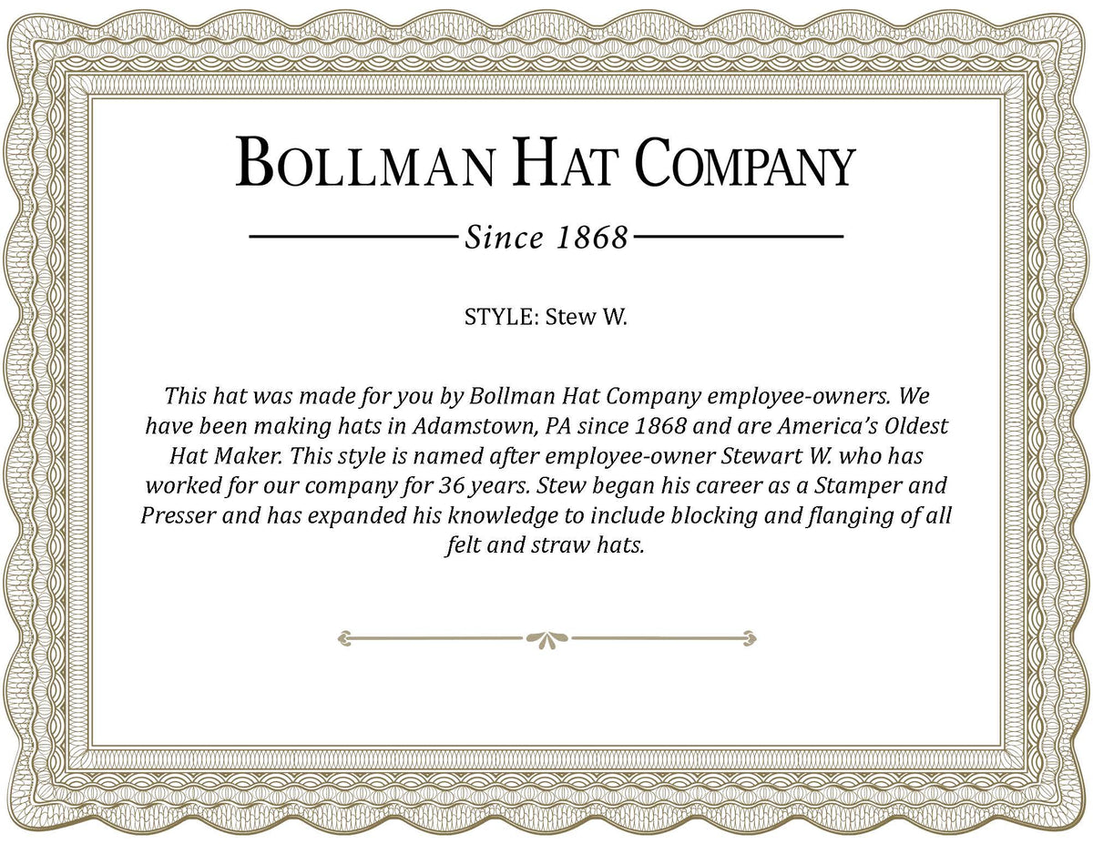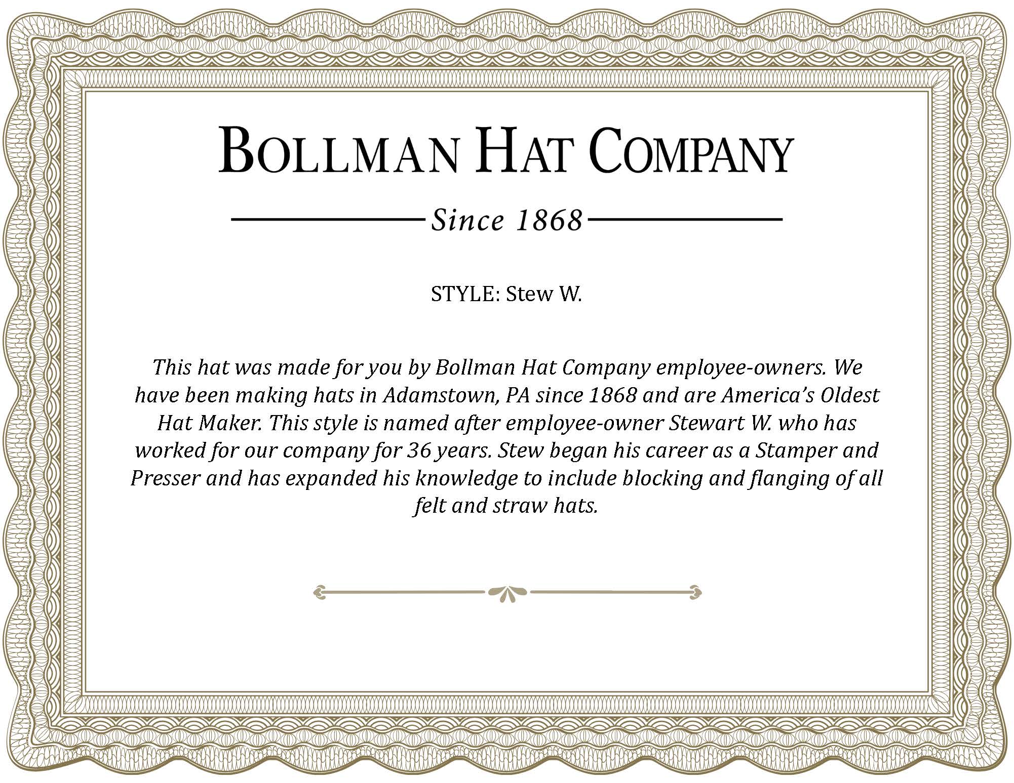 The Stew W. is from the Bollman Hat Company Makers' Collection, a selection of hats launched in our 150th year to celebrate the spirit, craftsmanship, and heritage of Bollman Hat Company and our employee-owners. Named after an employee-owner with at least 35 years of service, each hat comes with a numbered certificate of authenticity signed by employee-owners, a photo of employee-owners in our Adamstown, PA factory, and a branded hat box.