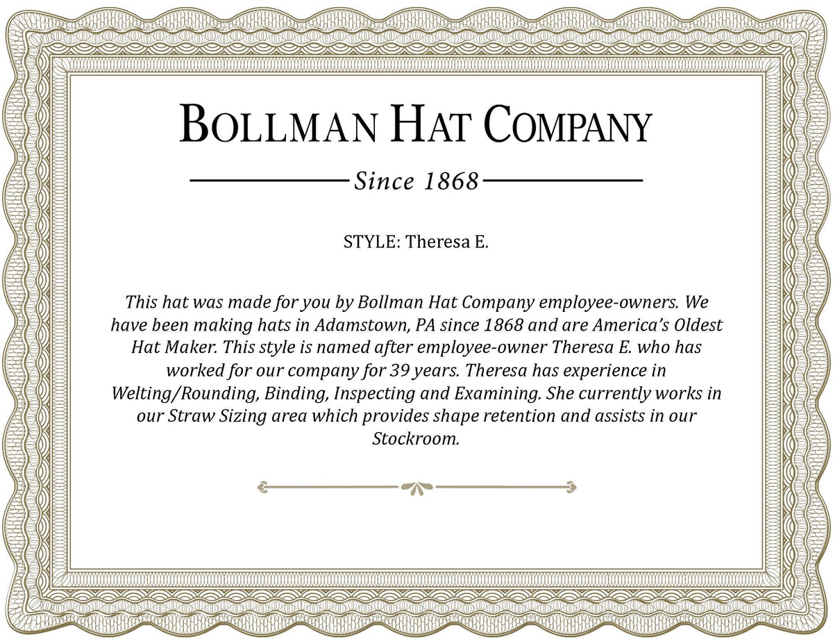The Theresa E. is from the Bollman Hat Company Makers' Collection, a selection of hats launched in our 150th year to celebrate the spirit, craftsmanship, and heritage of Bollman Hat Company and our employee-owners. Named after an employee-owner with at least 35 years of service, each hat comes with a numbered certificate of authenticity signed by employee-owners, a photo of employee-owners in our Adamstown, PA factory, and a hat box.