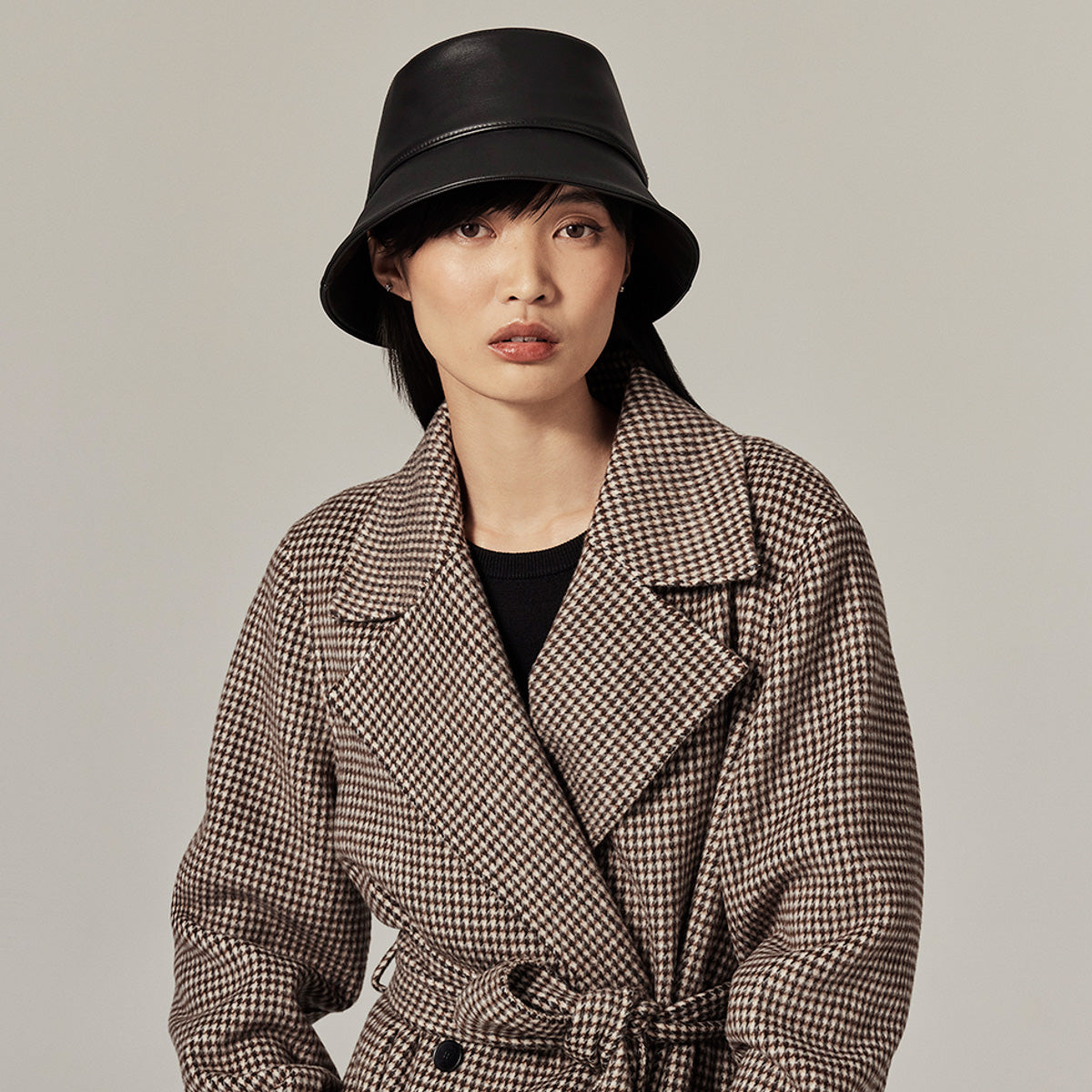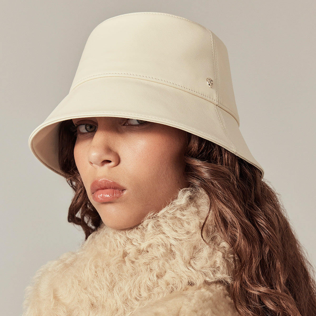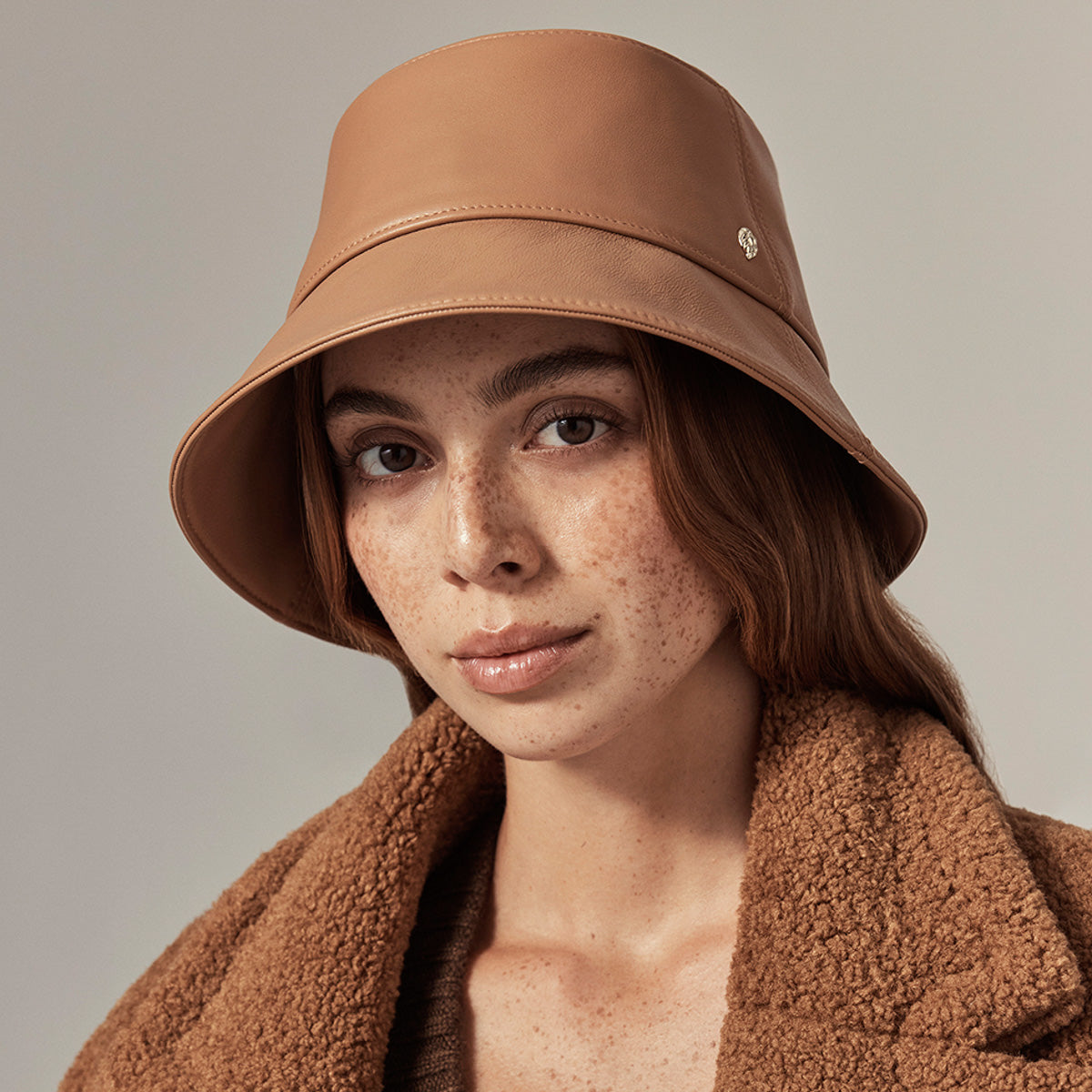 The Palmer Bucket by Helen Kaminski is crafted from buttery Nappa leather, featuring a softly tapered crown. Its clean lines and minimalist design are complemented by a lightweight cotton lining and adjustable inner band, ensuring all-day comfort. A sleek, refined silhouette with lasting appeal.