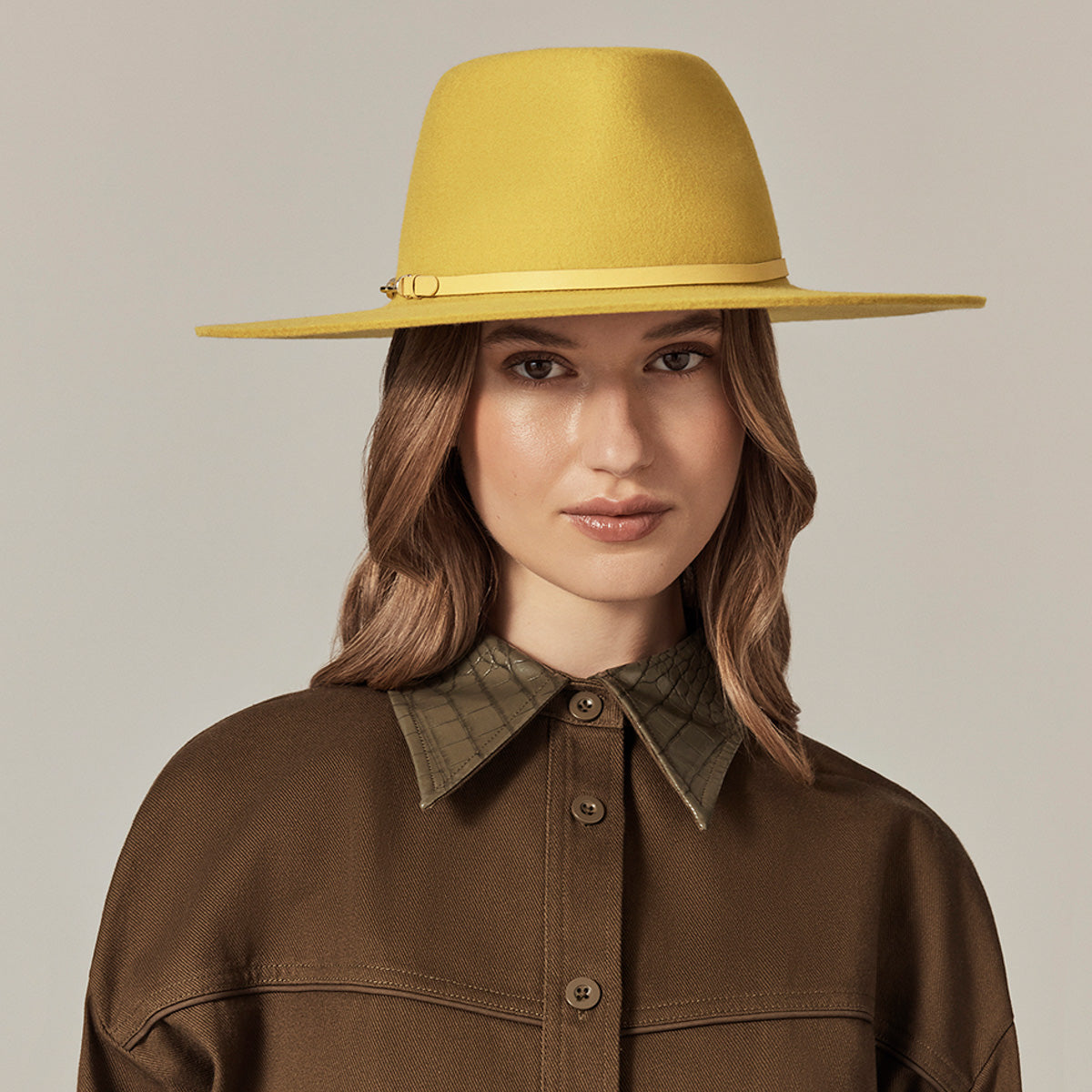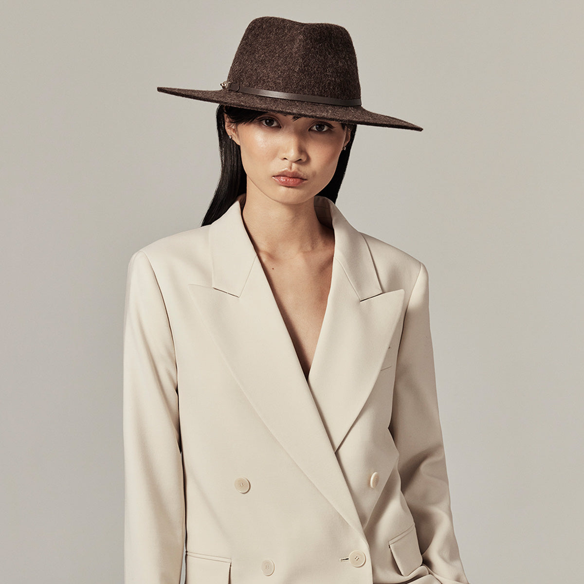 Bold yet timeless, the Helen Kaminski Claude Wool Fedora is crafted from rich Merino wool felt, offering a sculptural silhouette with a 10.5cm crown and flat 9cm brim. A smooth leather trim and signature equestrian snaffle detail elevate its classic shape with refined polish. Finished with a soft touch adjustable inner band and UPF 50+ protection, it brings modern elegance to seasonal dressing.