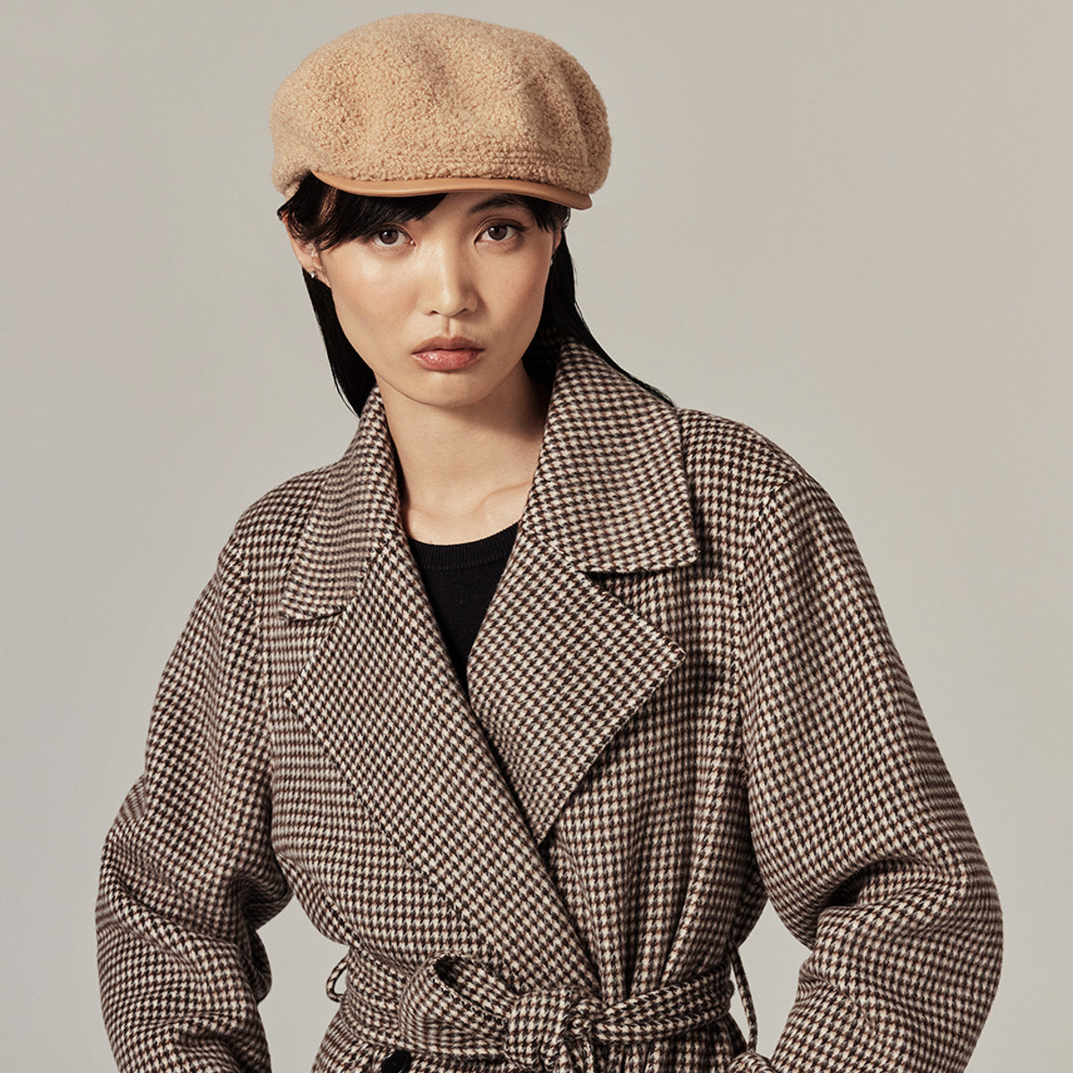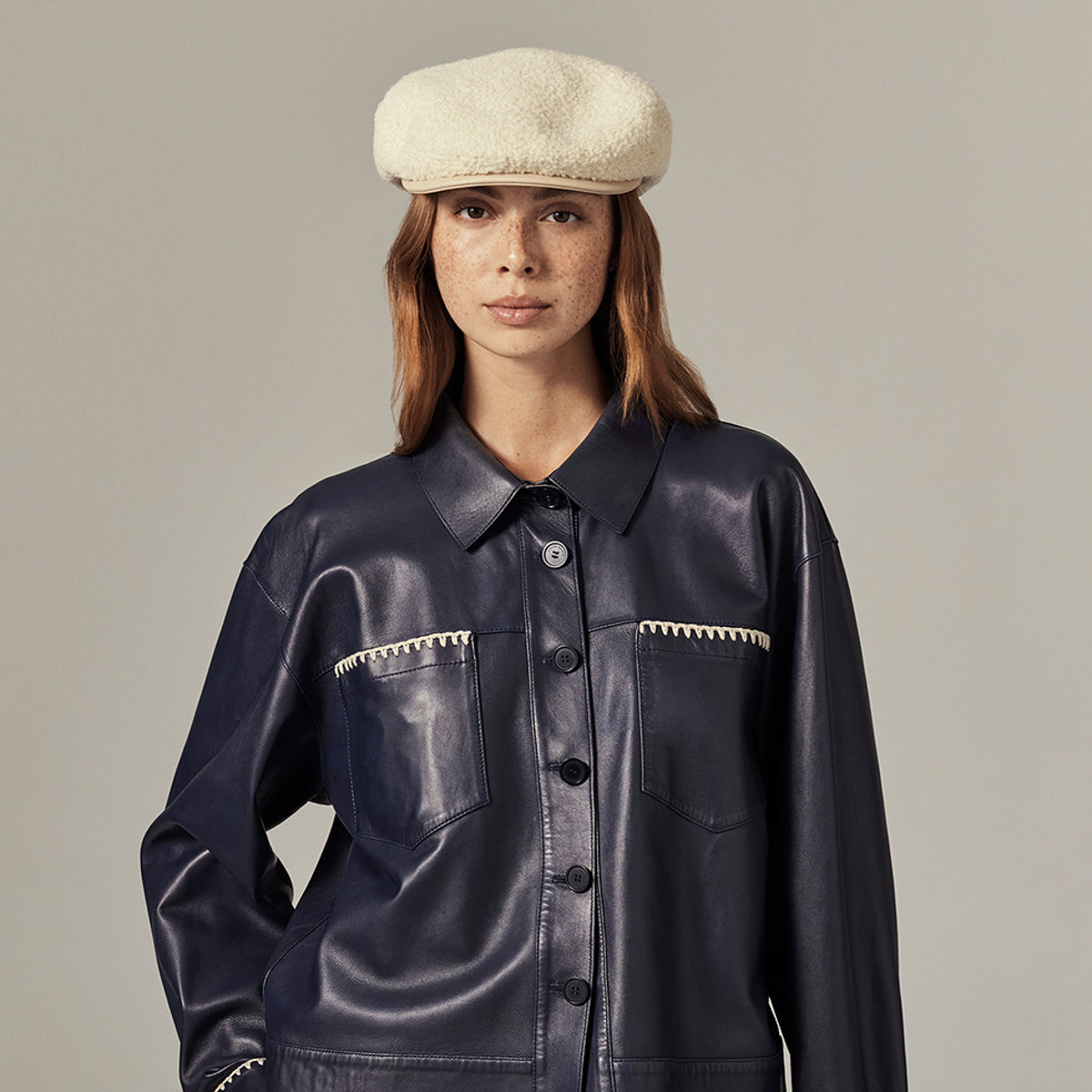 Rooted in tradition, the Clive Flat Cap by Helen Kaminski offers a heritage-inspired silhouette, redesigned in an Italian wool blend bouclé. The structured leather peak lends timeless distinction, while the cotton inner band and pin dot lining ensure comfort and a tailored fit. A modern classic designed with enduring appeal.