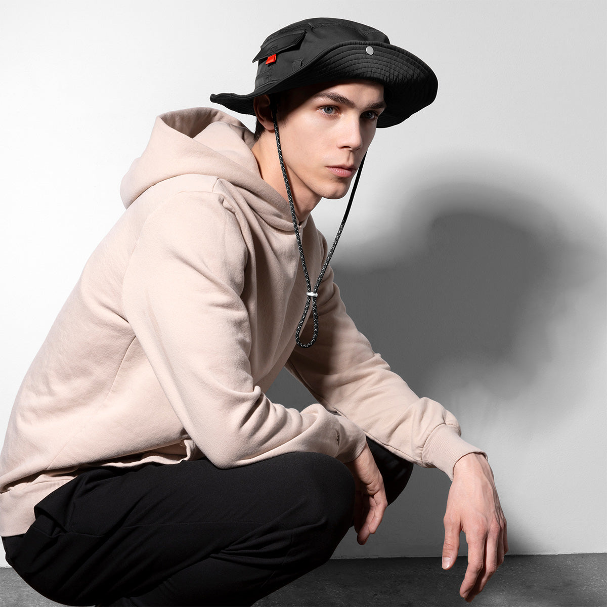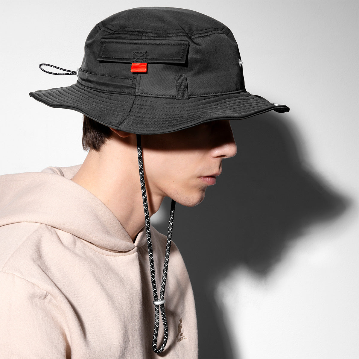 The Easy Carry Fisherman Hat by Kangol is lightweight and water repellent bucket hat. Crafted with a soft wicking mesh sweatband for comfort, it features 2 Velcro closure pockets, a front snap to adjust the brim, elastic loops at the sides of the head to slide in your sunglasses, and a detachable/adjustable reflective chin cord so losing this hat is not an option. It is complete with a bungee/toggle adjuster at the back for fit and a raised tonal silicone Kangol word-mark logo at the left side of the head.