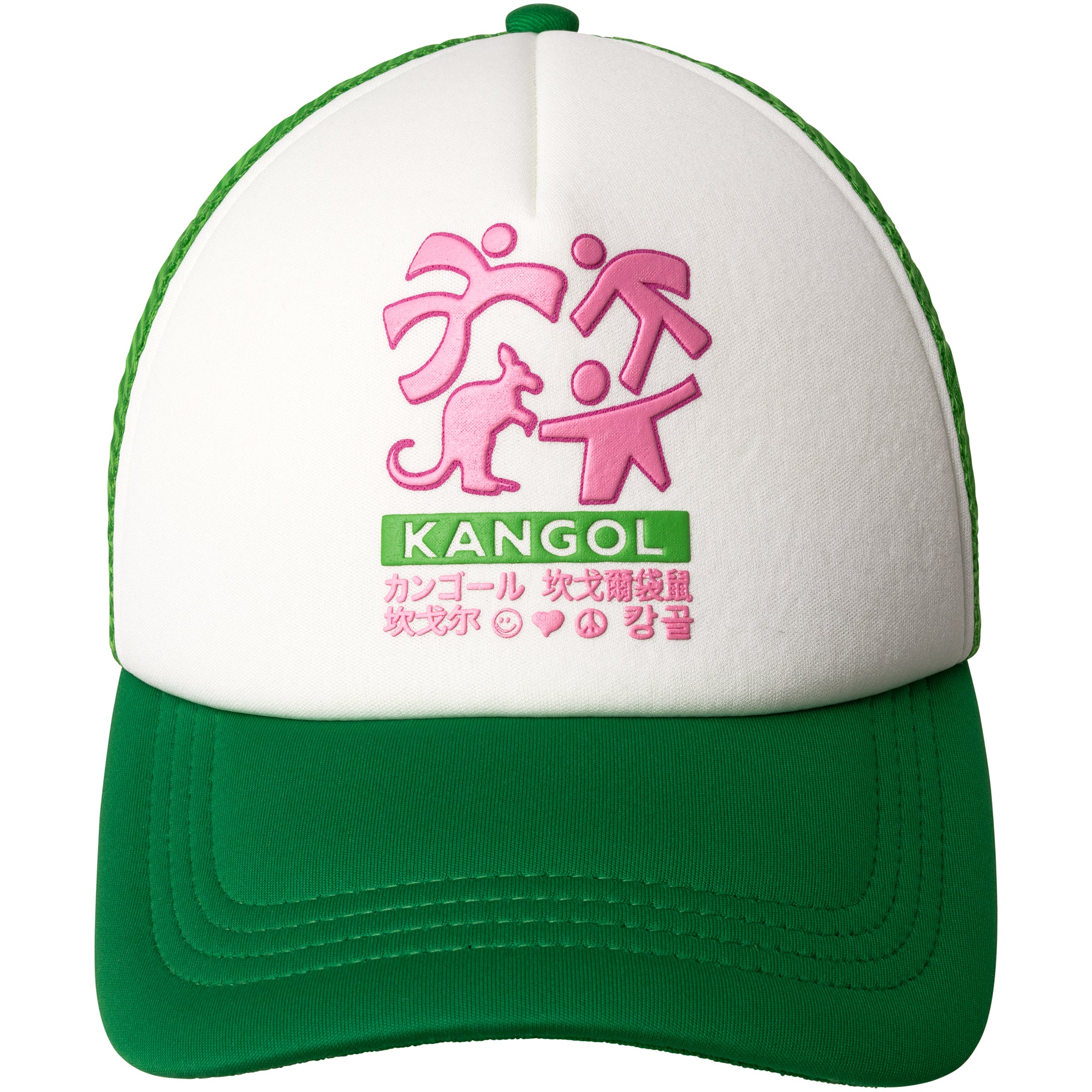 The Unity Puff Print Trucker Hat by Kangol puts a creative spin on the classic trucker cap silhouette. Designed with a foam-backed front panel and a double-row snapback closure, this hat offers lightweight structure and an adjustable fit. The front features a raised puff-print graphic showcasing the iconic Kangol kangaroo united with friends, with Kangol lettering in multiple languages beneath for a global-inspired touch. Finished with a subtle Kangol® Kangaroo logo loop label at the back opening, this style blends statement design with everyday wearability.