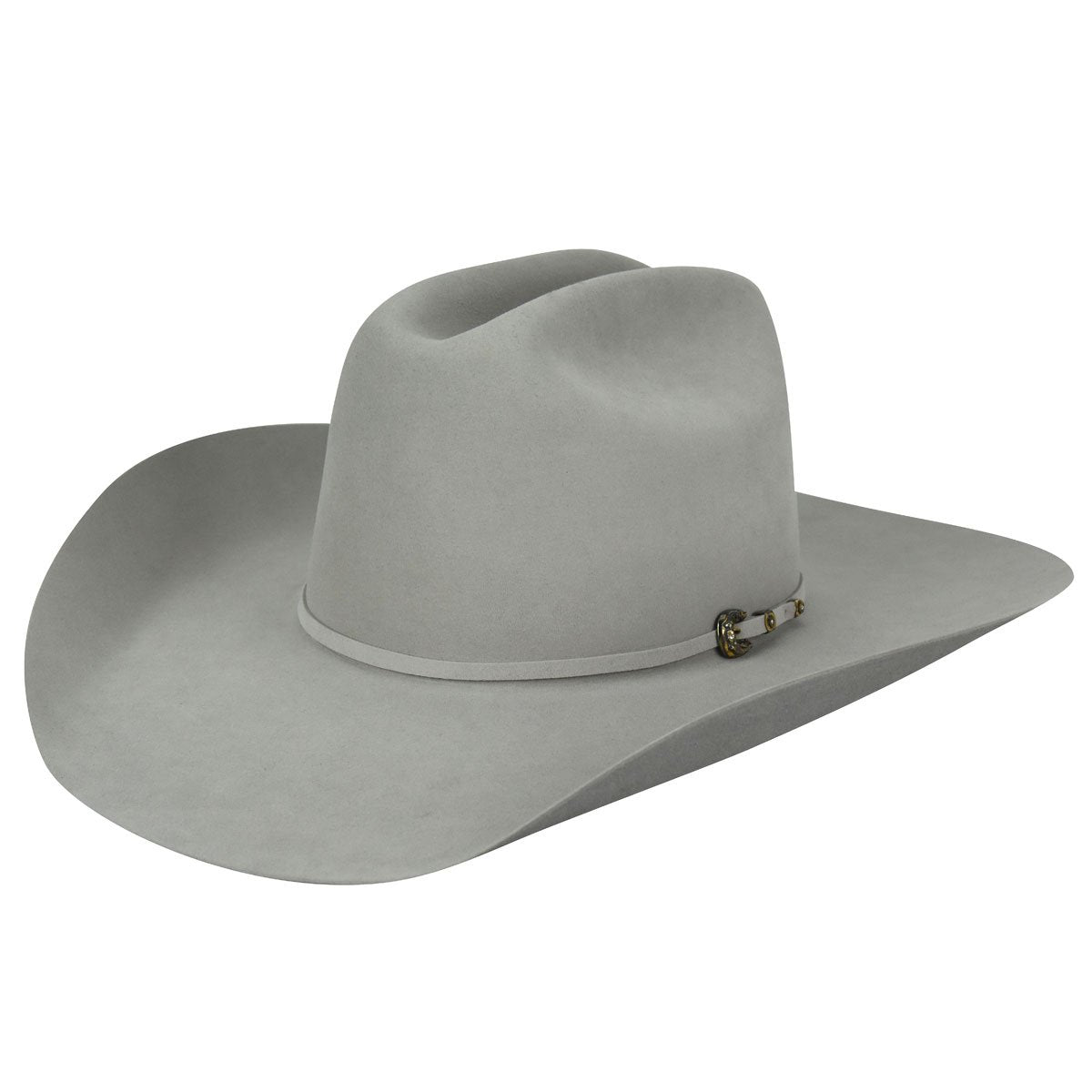 The Bailey Western Legacy 100X is a 100% pure beaver fur felt western hat. It has a 4.5" cattleman crown and a self-felt hatband that is fancied up with a silver bucket set embellished with three blue stones.