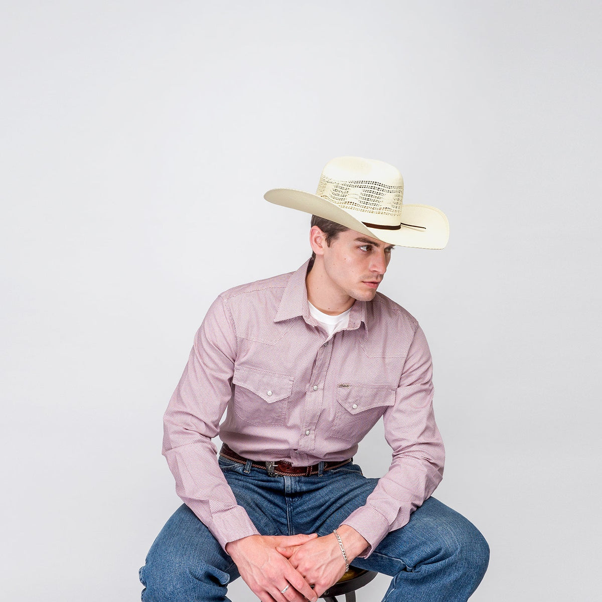 The Ricker by Bailey Western is a natural colored Marlboro crown with a simple 2ply brown band and spur pin. It features a wide venting pattern and Dri-Lex® sweatband to keep you cool and comfortable in the summer heat.