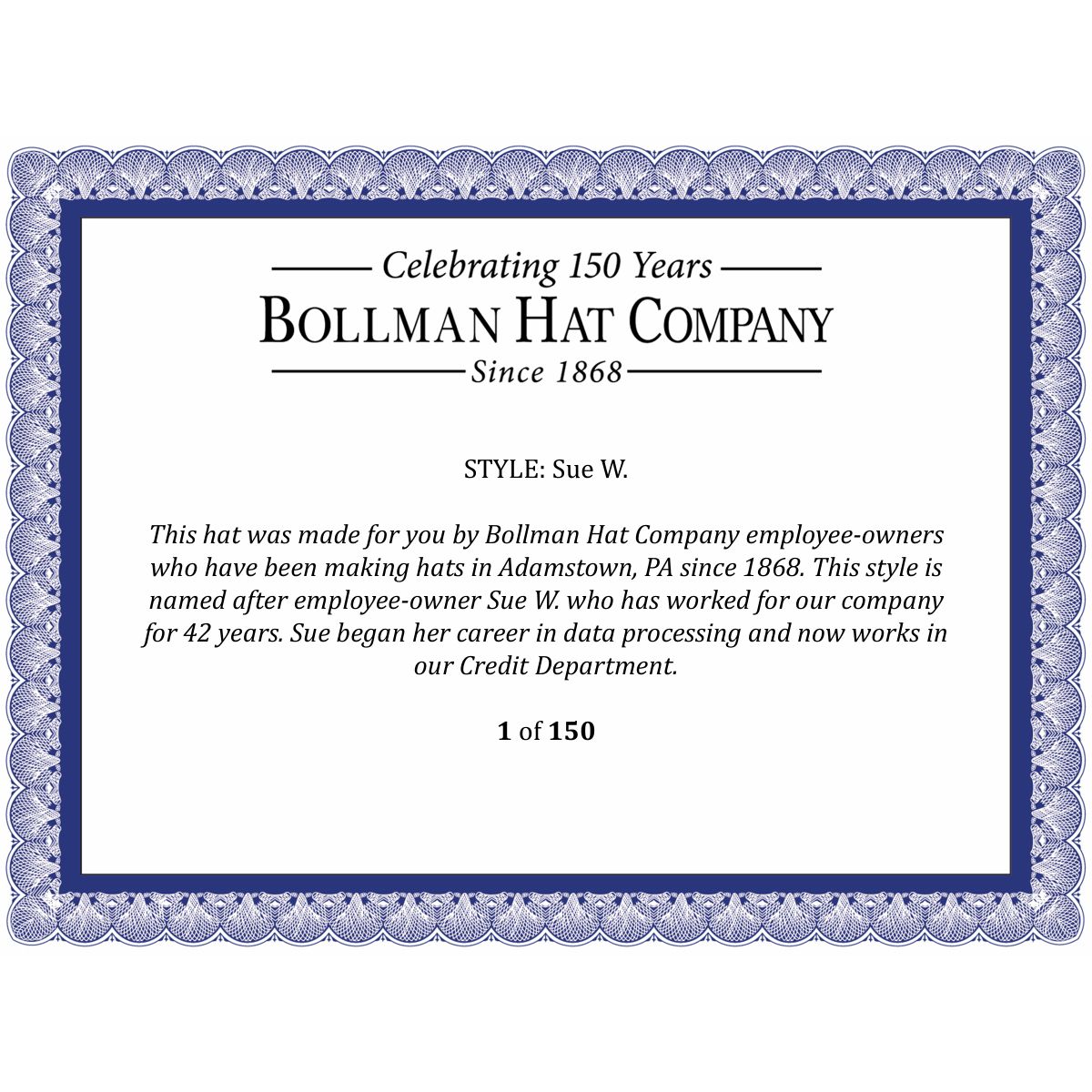 The Sue W. is from the Bollman Hat Company Makers' Collection, a selection of hats launched in our 150th year to celebrate the spirit, craftsmanship, and heritage of Bollman Hat Company and our employee-owners. Named after an employee-owner with at least 35 years of service, each hat comes with a numbered certificate of authenticity signed by employee-owners, a photo of employee-owners in our Adamstown, PA factory, and a branded hat box.